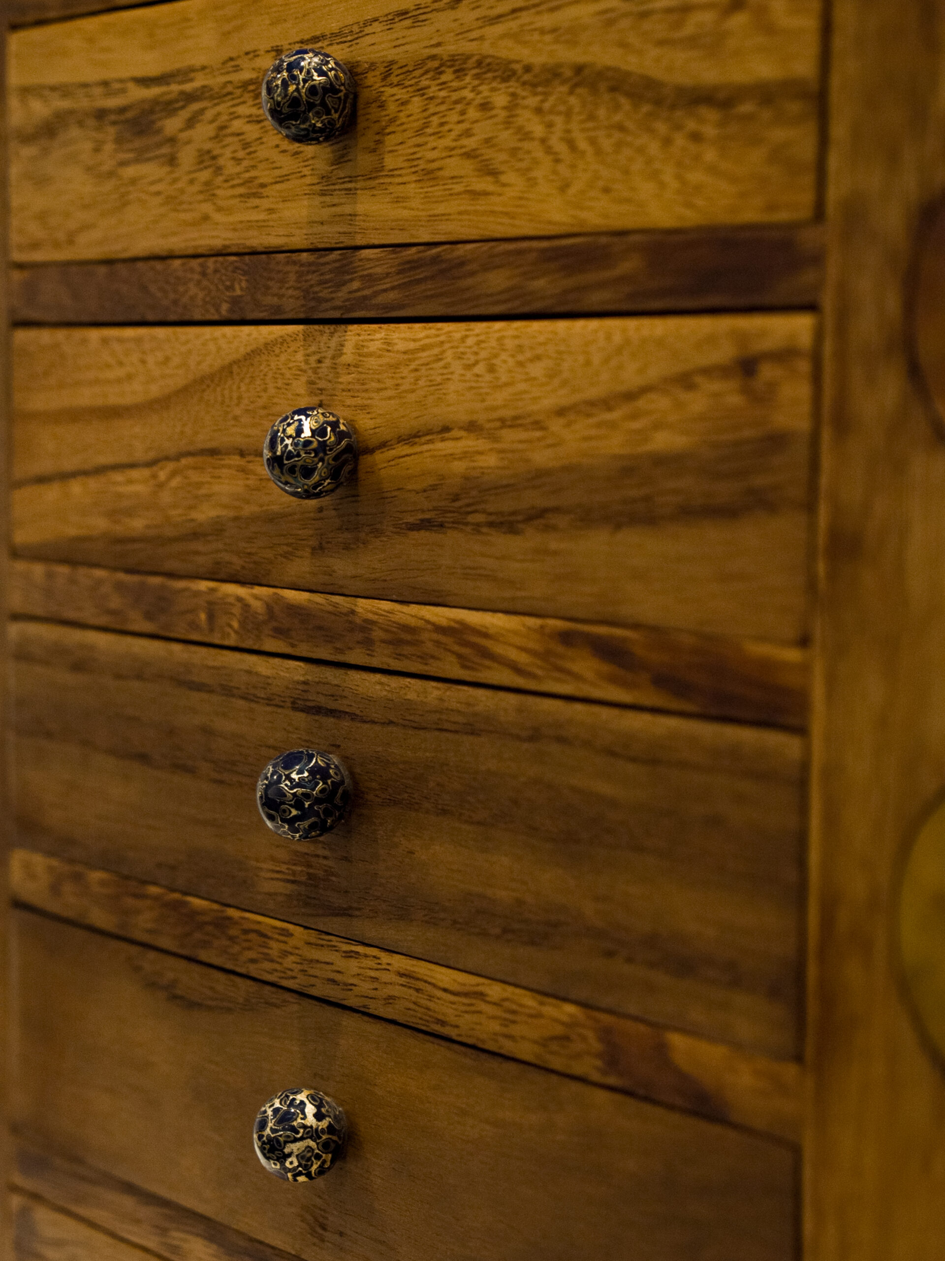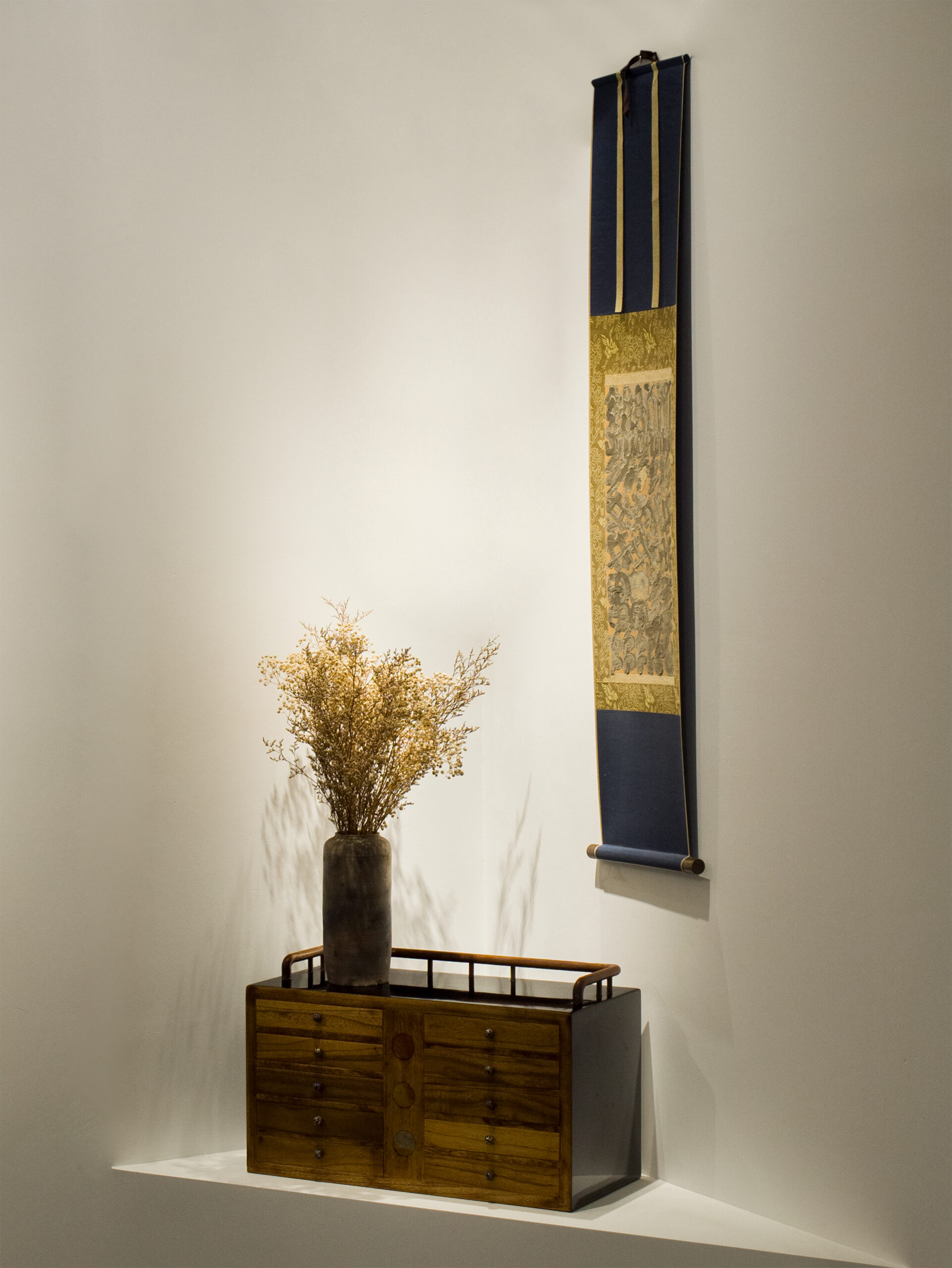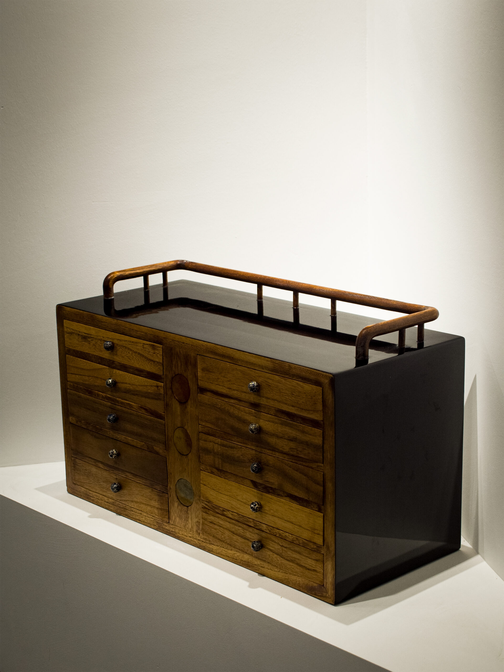 立柜整体稳定、有量感,传达中庸、含蓄的文化特征,体现儒家的“中和”思想。通过常见材料的使用和简约的造型设计,赞比亚血檀质感加上传统的榫卯结构,利用线条与面构成的简约之美,尽显简洁雅致的本色。